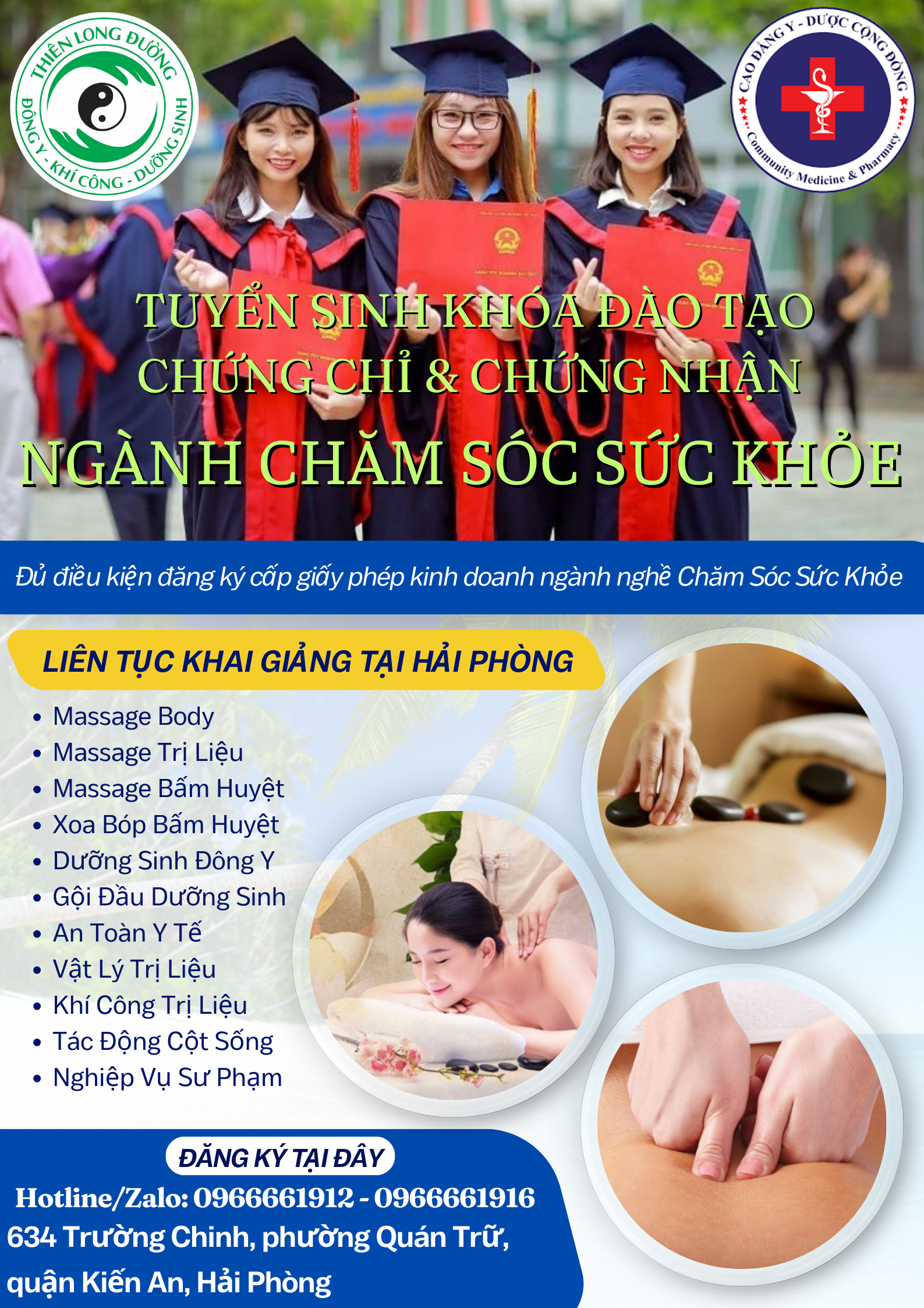 Trung tâm Y Dược Cộng Đồng - Thiên Long Đường ở tại thành phố Hải Phòng liên tục khai giảng Lớp Sơ Cấp Nghề Chăm Sóc Sức Khỏe tại Hải Phòng. Quý học viên có nhu cầu học tập và quan tâm đến Bộ môn Chăm Sóc Sức Khỏe vui lòng liên hệ với Ban tuyển sinh của Trung tâm Y Dược Cộng Đồng - Thiên Long Đường